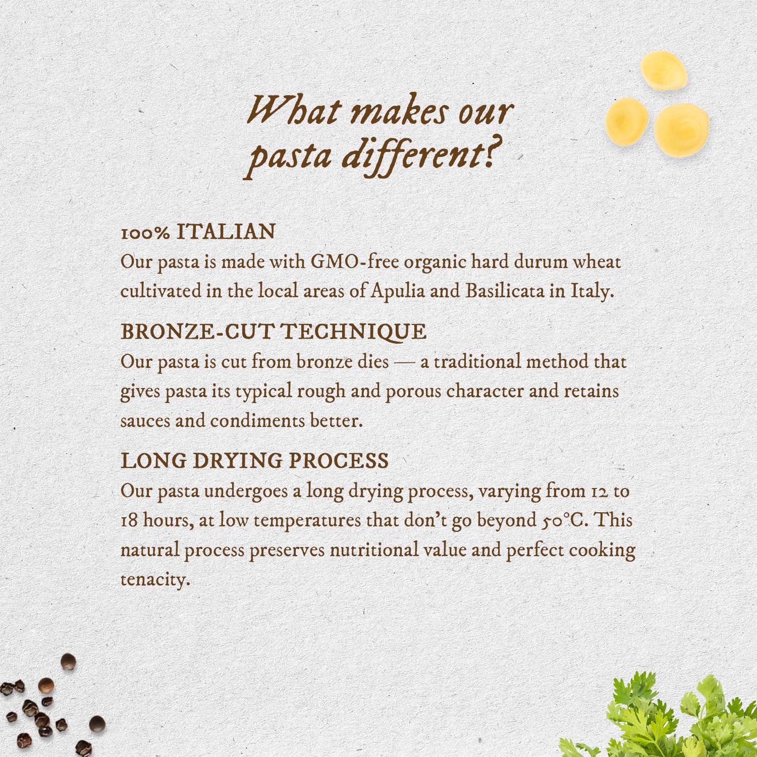 Anmara Artisanal Orecchiette Pasta brings the heart of Italy to your kitchen. Made from 100% organic, GMO-free hard durum wheat grown in Puglia, this pasta represents authenticity and quality. The traditional bronze-cut technique gives the pasta a rough, porous surface, ensuring sauces adhere perfectly for an elevated dining experience.
