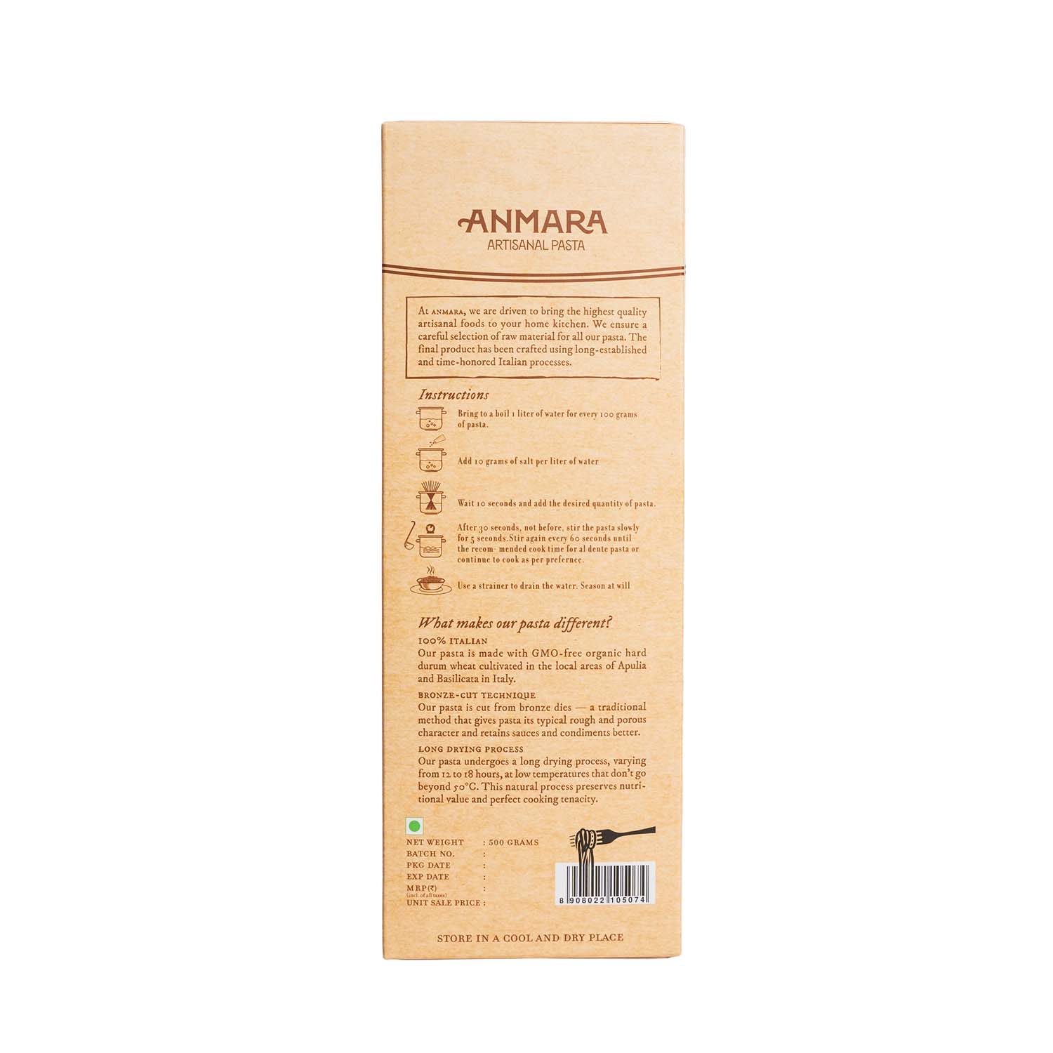 Cook Anmara Organic Spaghetti Pasta in boiling salted water for 8-10 minutes for a perfect al dente texture.