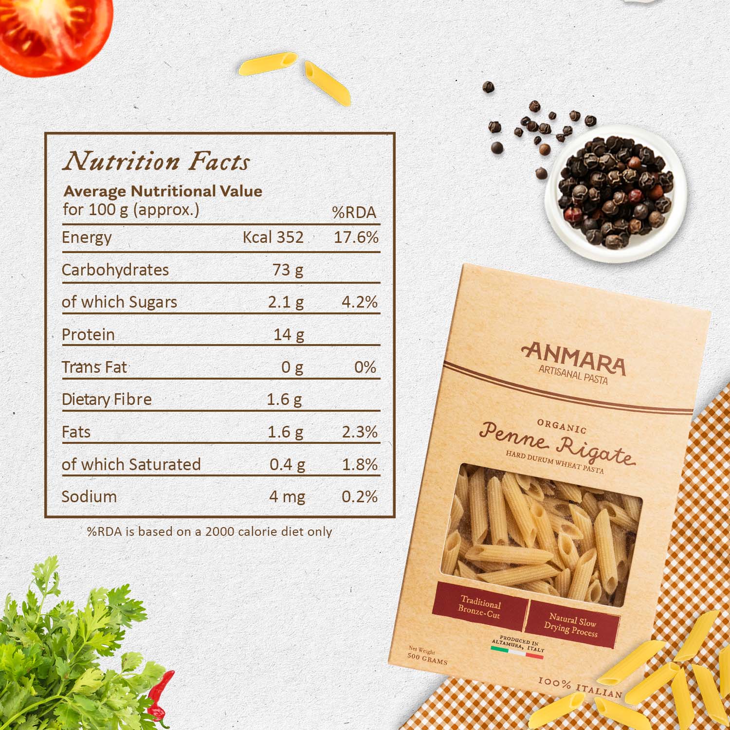 Anmara Organic Penne Rigate Pasta is a celebration of Italian culinary heritage. Made from 100% organic Puglian hard durum wheat semolina, this pasta features the traditional bronze-cut technique, which creates a coarse surface to hold sauces and deliver a rich flavor with every bite.