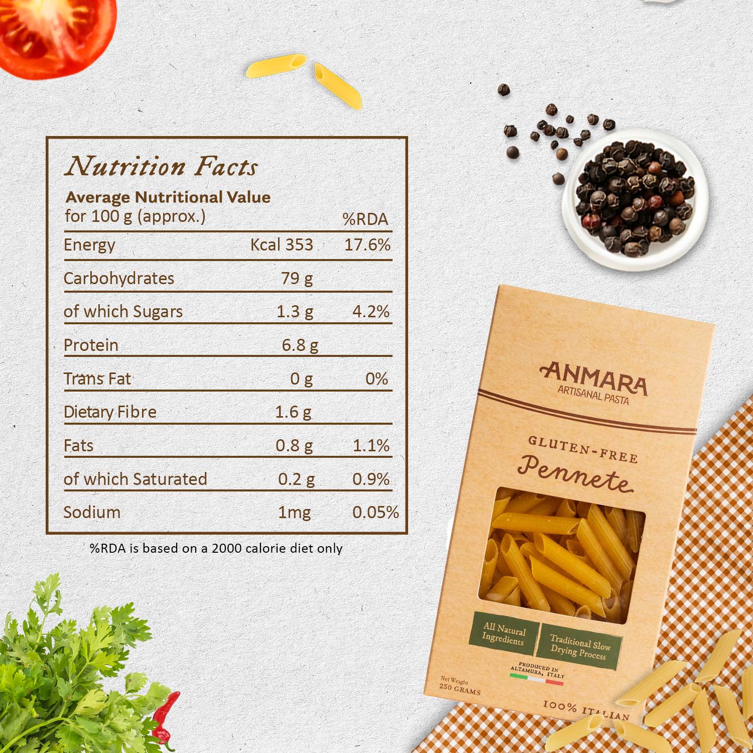 Anmara Gluten-Free Pennete Pasta is the ultimate choice for those seeking a healthy, gluten-free meal option. Crafted from 100% natural and GMO-free ingredients, including white corn flour, yellow corn flour, and rice flour, this pasta provides exceptional taste and texture without compromising dietary needs.
