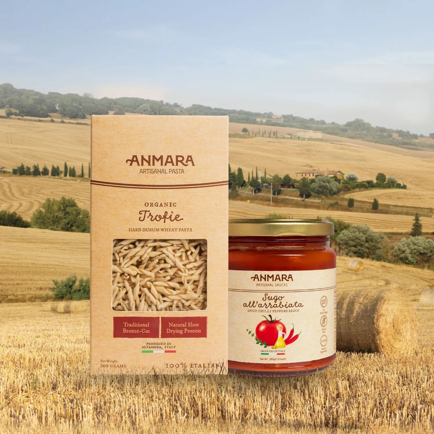 Turn any meal into an Italian classic with this irresistible pasta-and-sauce pairing from Anmara. Our Organic Trofie Pasta is made from 100% hard durum wheat, shaped into traditional short twists, and slow-dried for perfect texture. Paired with our bold, spicy Arrabbiata Sauce—crafted from ripe Italian tomatoes, garlic, chili peppers, and herbs—this combo delivers authentic flavor with a fiery kick.