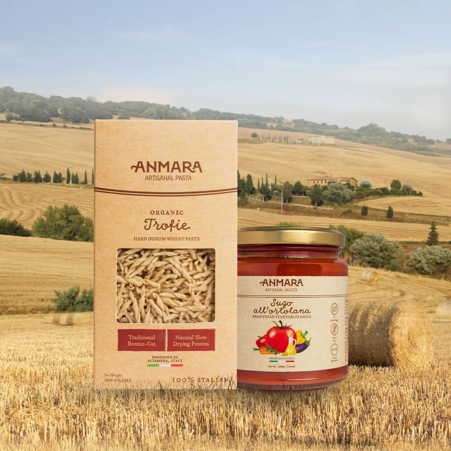 Bring authentic Italian flavors to your table with Anmara’s premium pasta-and-sauce duo. The Organic Trofie Pasta is crafted from 100% hard durum wheat, shaped in the traditional short, twisted style, and slow-dried to preserve flavor and texture. Paired with our Ortolana Mixed Vegetable Sauce—rich with the taste of fresh, sun-ripened vegetables—this combo offers a ready-to-enjoy gourmet Italian meal in minutes.